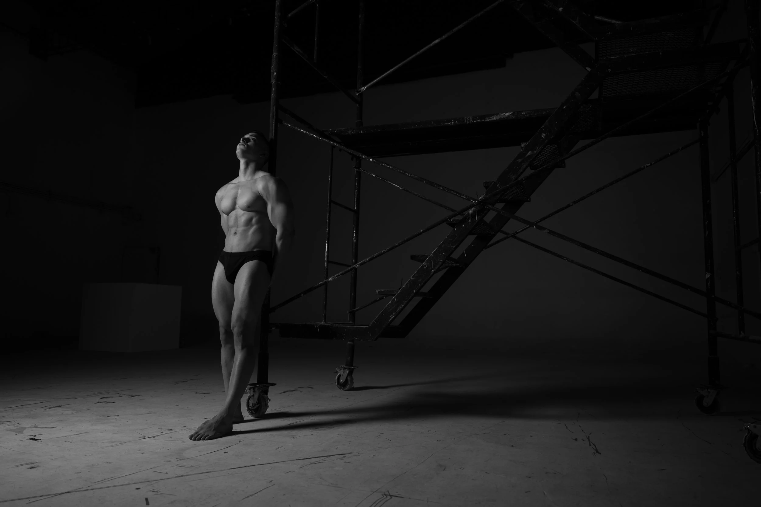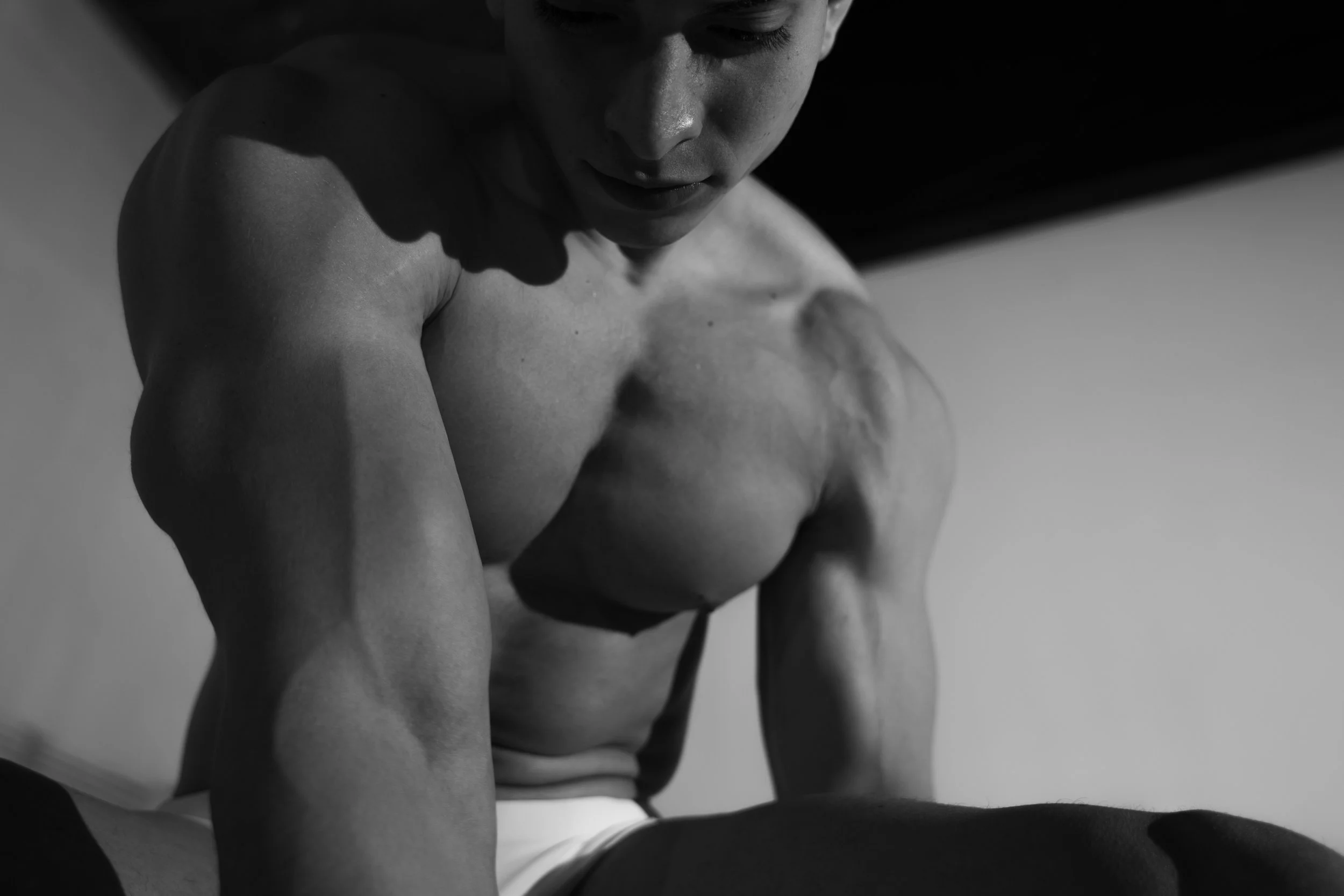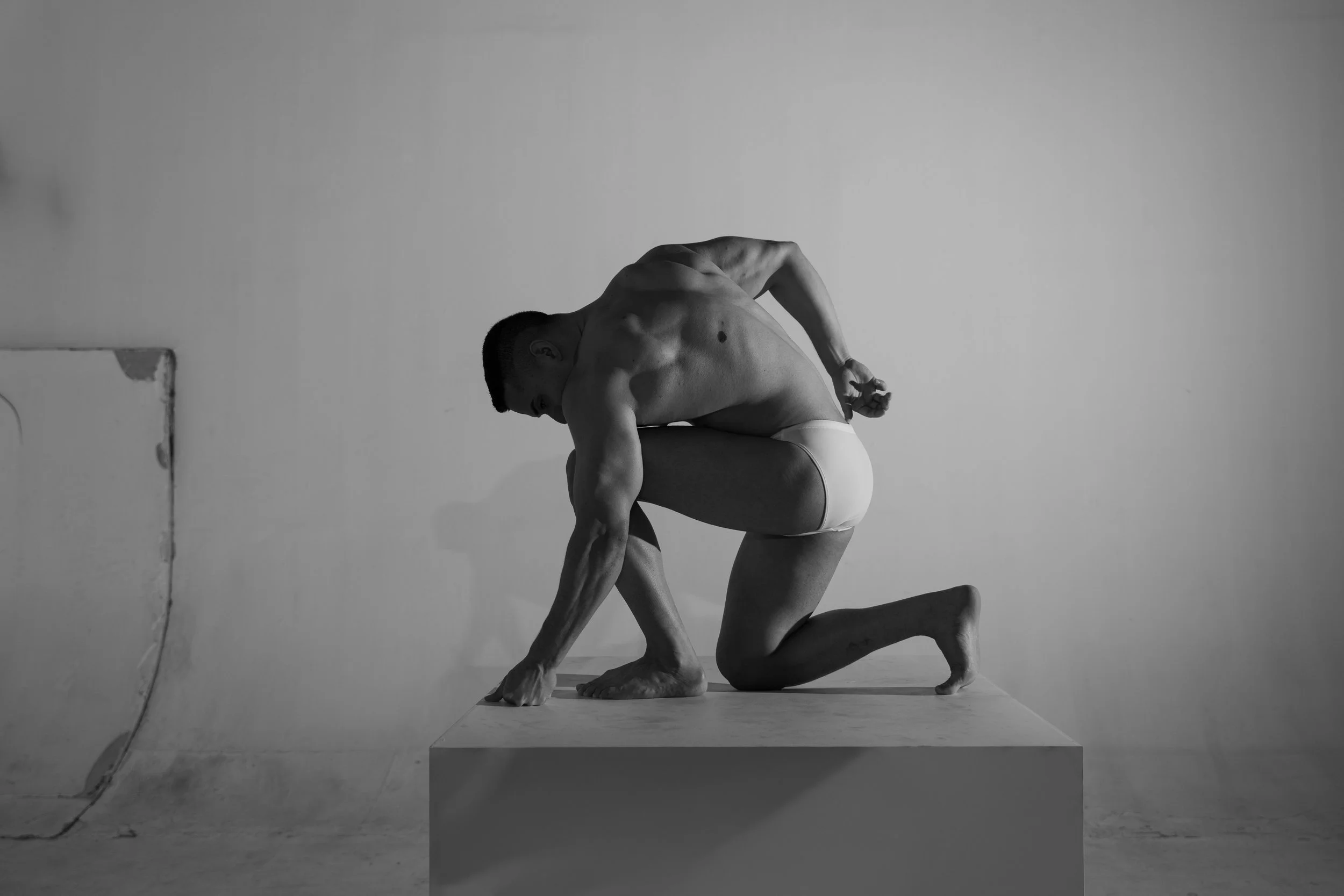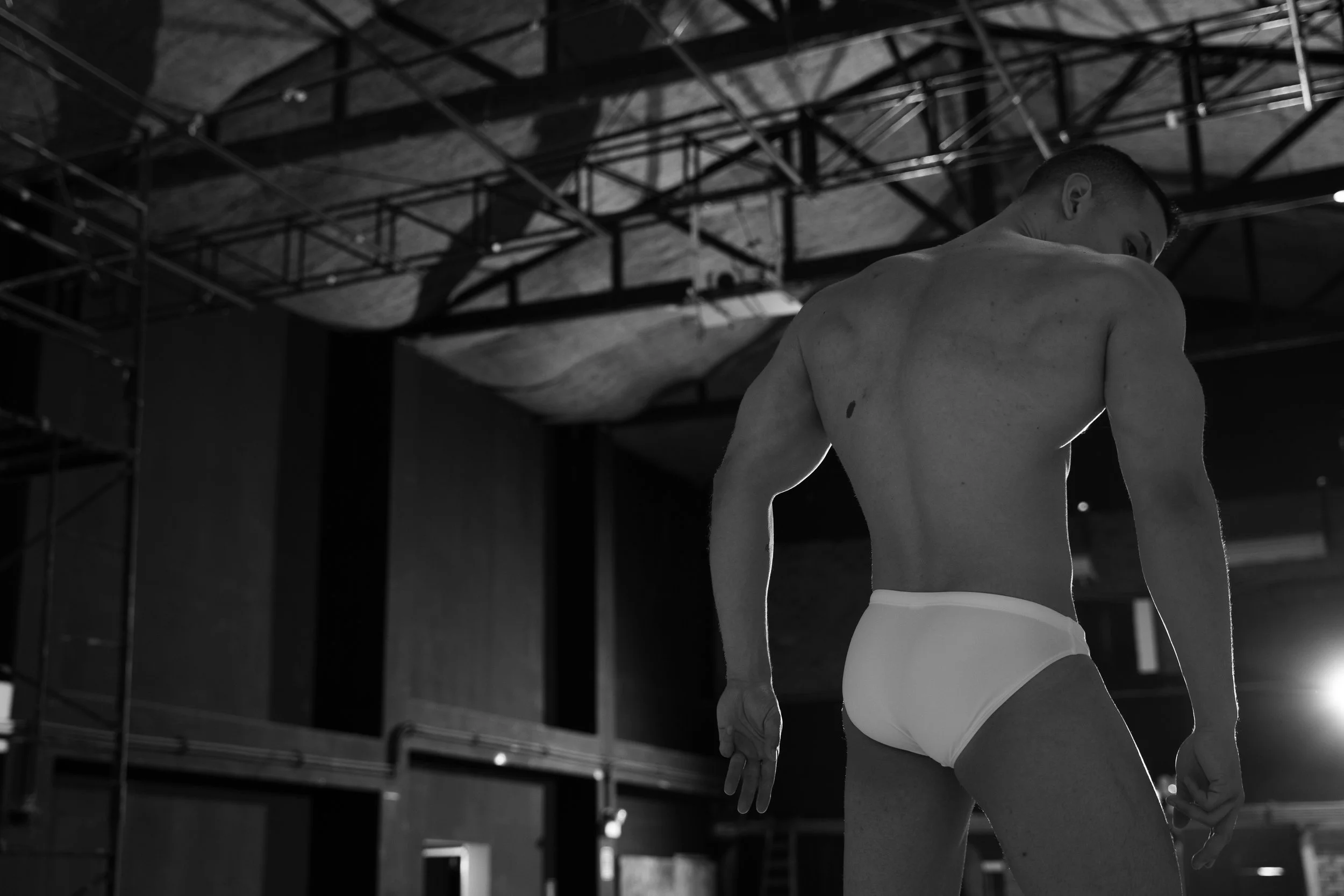 Tarima (stage) portrays three young Venezuelan men living in Peru, whose work unfolds on stage. Removed from the spectacle, the images focus on their bodies—where strength and vulnerability coexist.