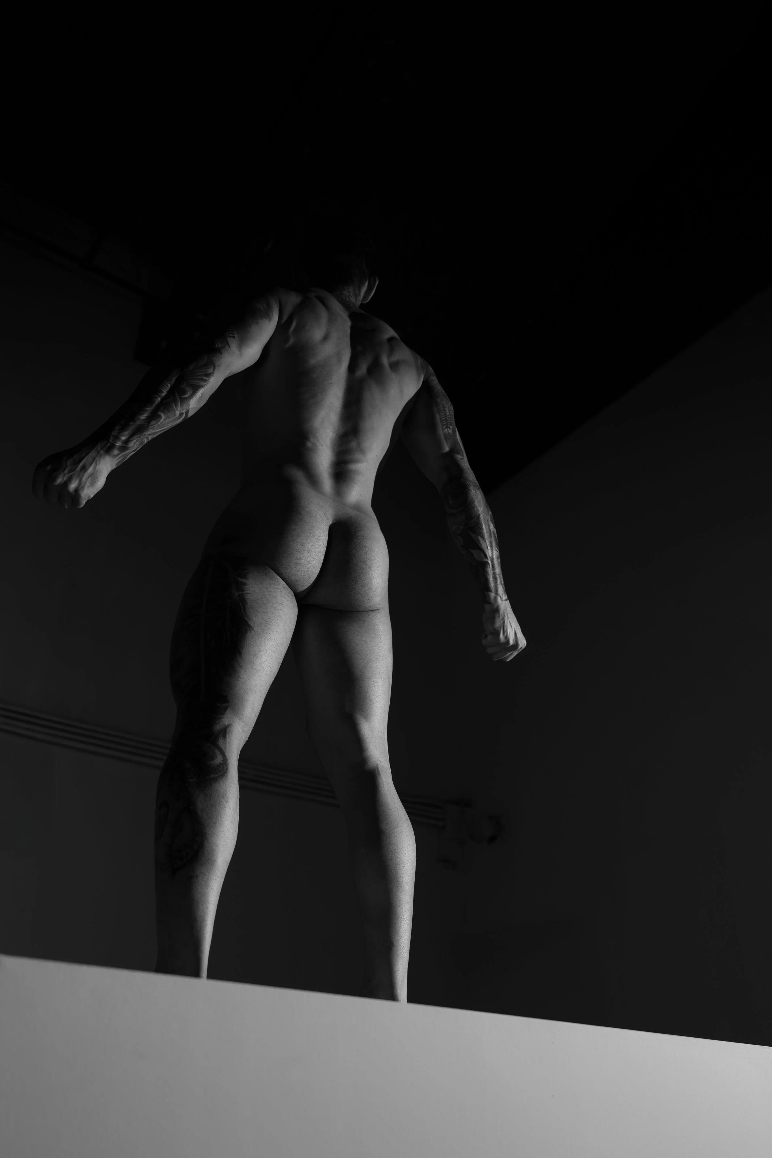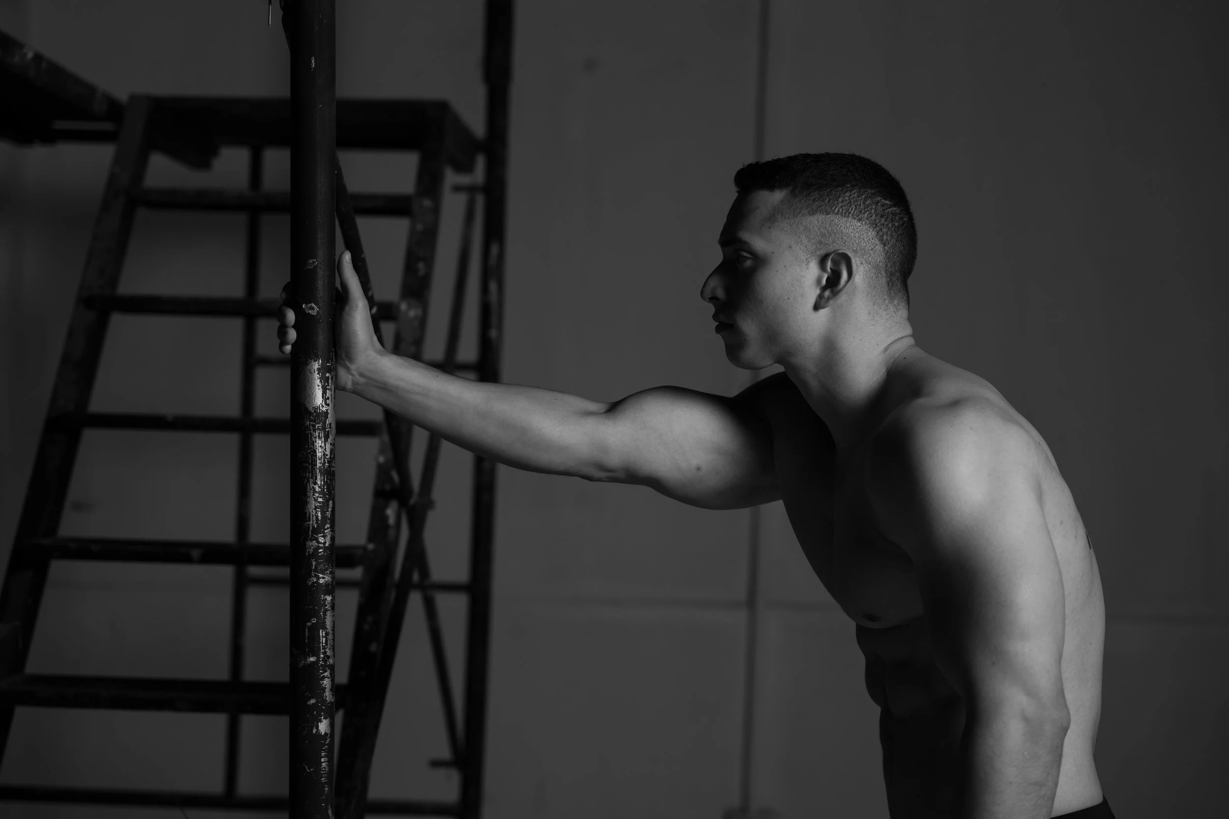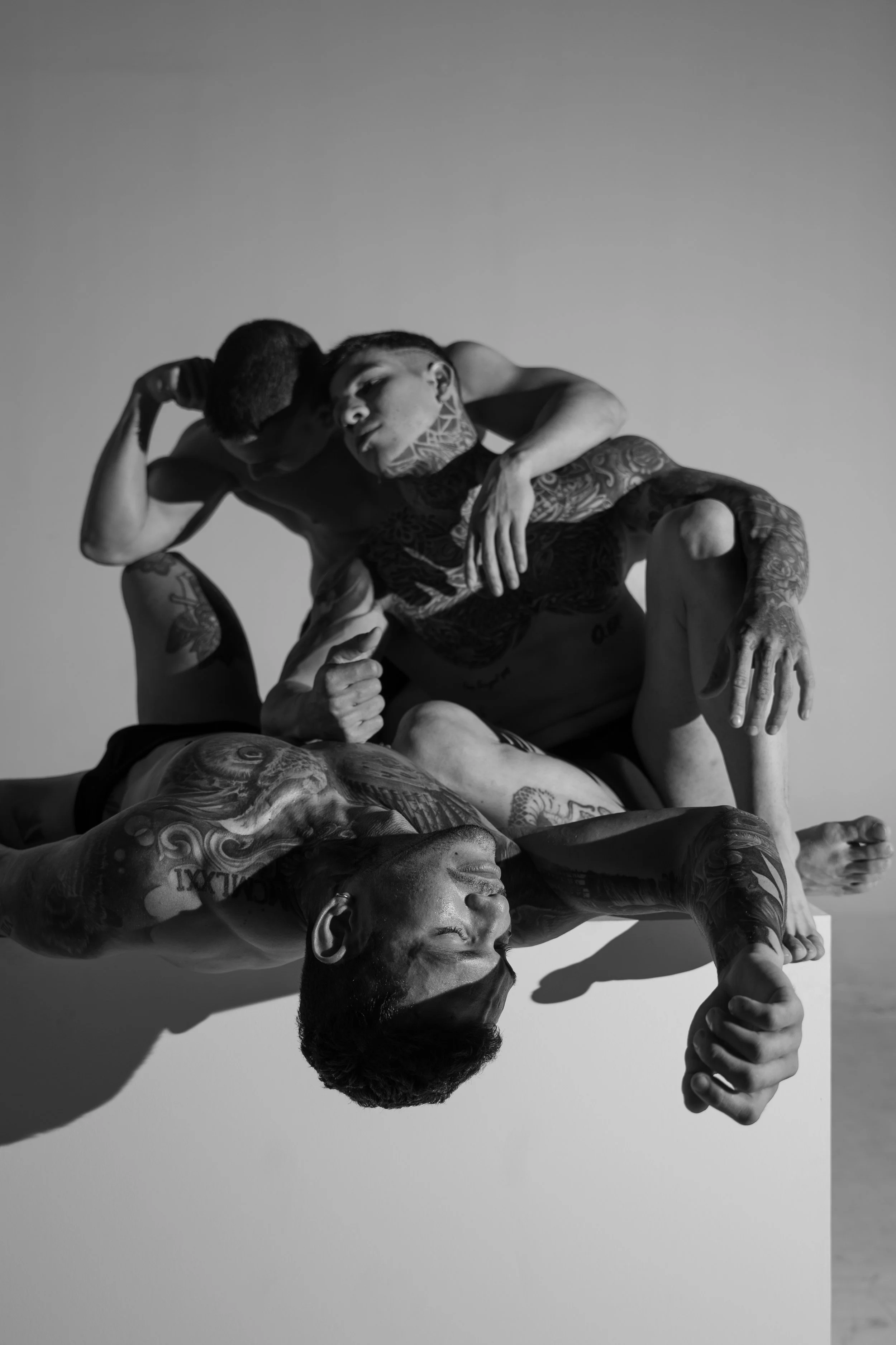 Tarima (stage) portrays three young Venezuelan men living in Peru, whose work unfolds on stage. Removed from the spectacle, the images focus on their bodies—where strength and vulnerability coexist.