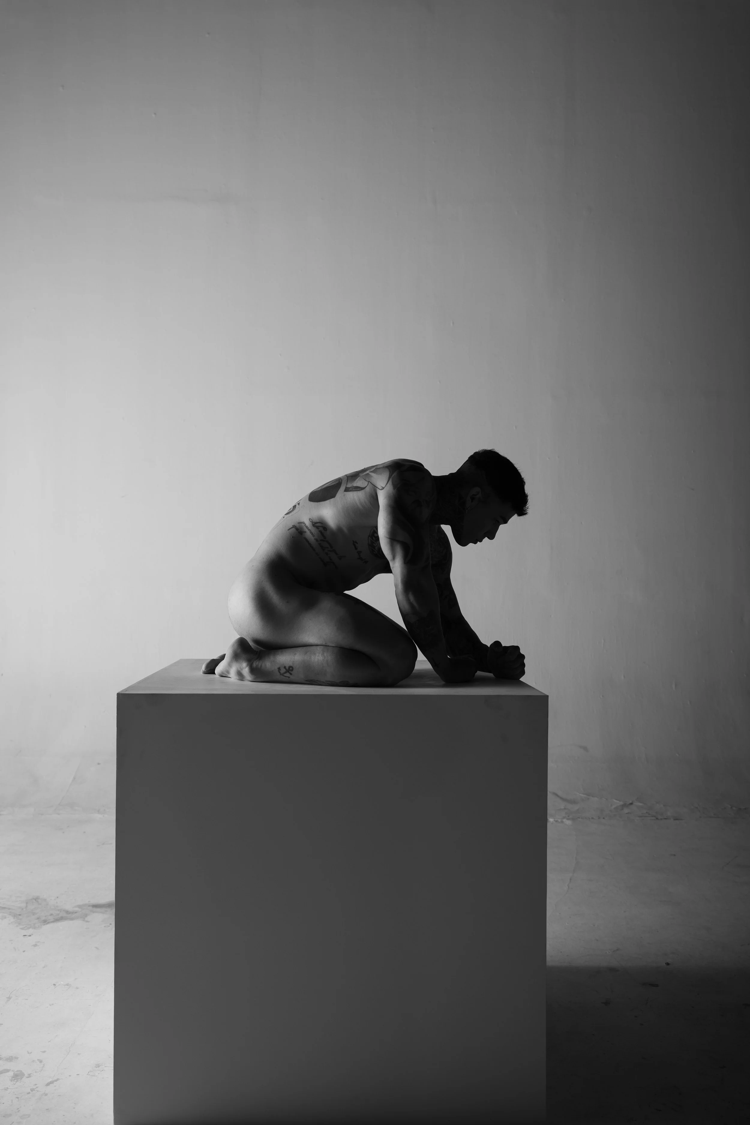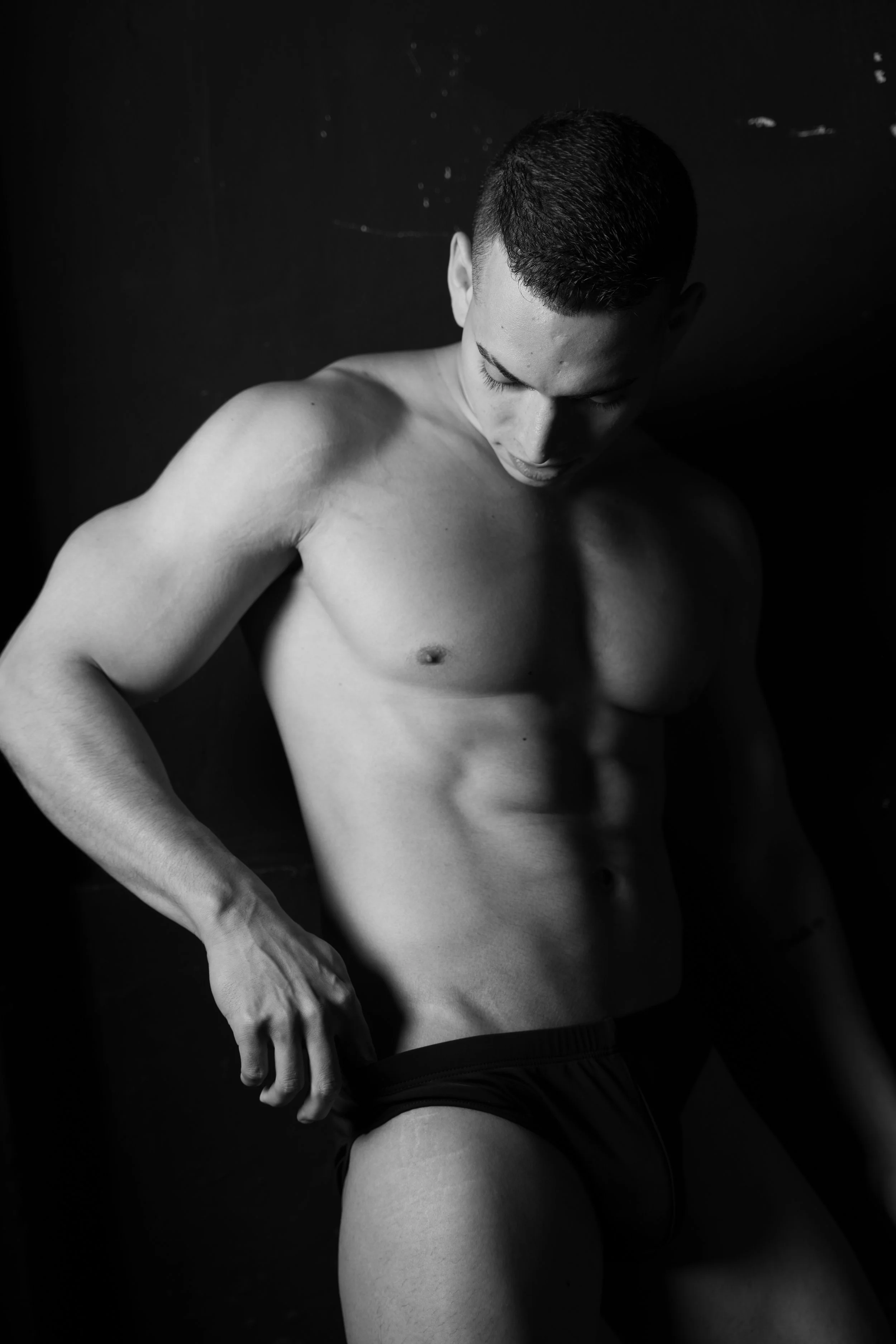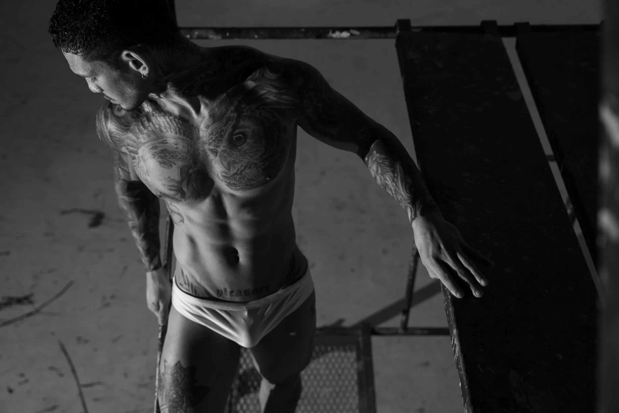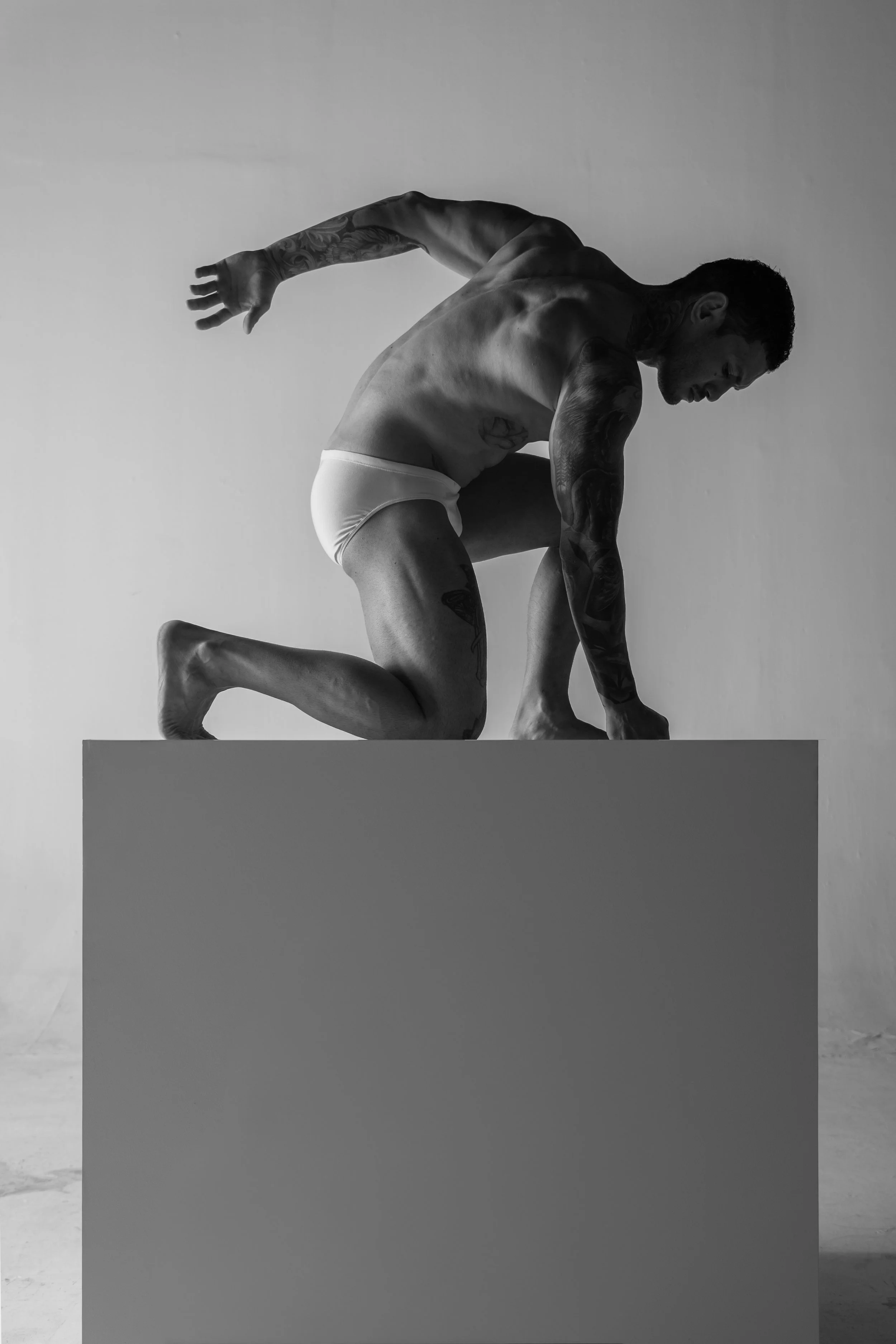 Tarima (stage) portrays three young Venezuelan men living in Peru, whose work unfolds on stage. Removed from the spectacle, the images focus on their bodies—where strength and vulnerability coexist.